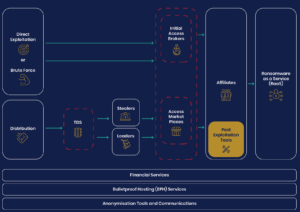 Here is a simplified ransomware workflow from the NCSC’s recent report – this highlight the ecosystem of the dark web where each function within this workflow can be offered by a different threat actor. Alternatively, depending on the skills of the group or threat actor, multiple functions can be offered together.